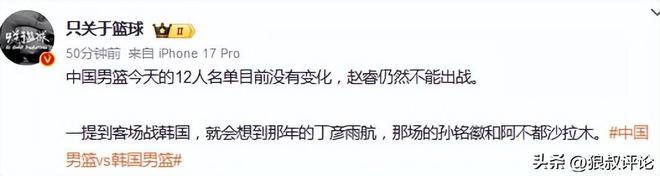 篮球记者贾磊发文点评:赵睿不会出战今晚对阵韩国的世预赛,期待我们的后卫线有人能够挺身而出!中国队加油!